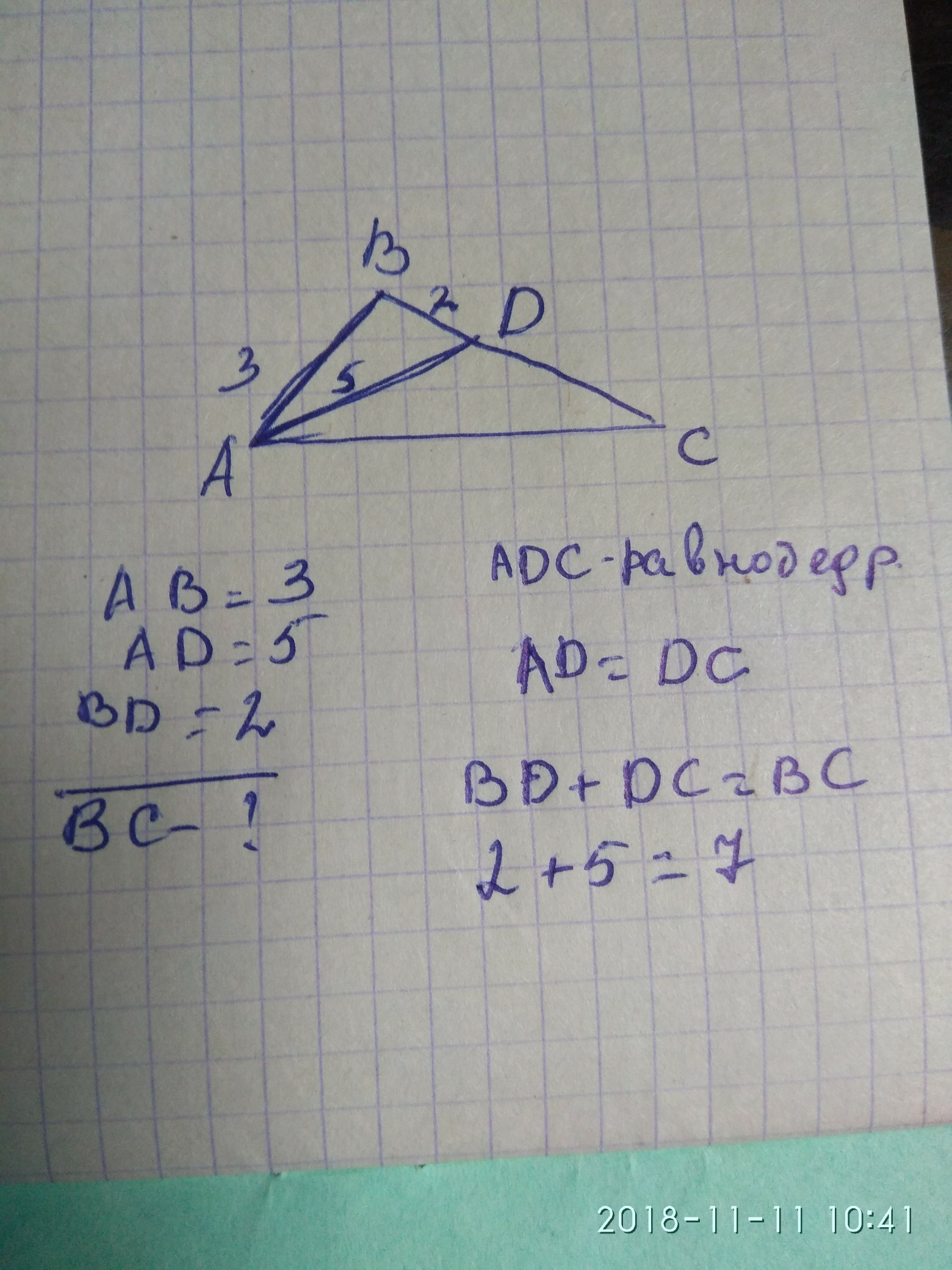 В треугольнике ABC со стороной AD=5 проведена биссектриса AD угла BAC. Треугольник ADC равнобедренный с основанием AC. Найдите BC, если AB:BD=3:2