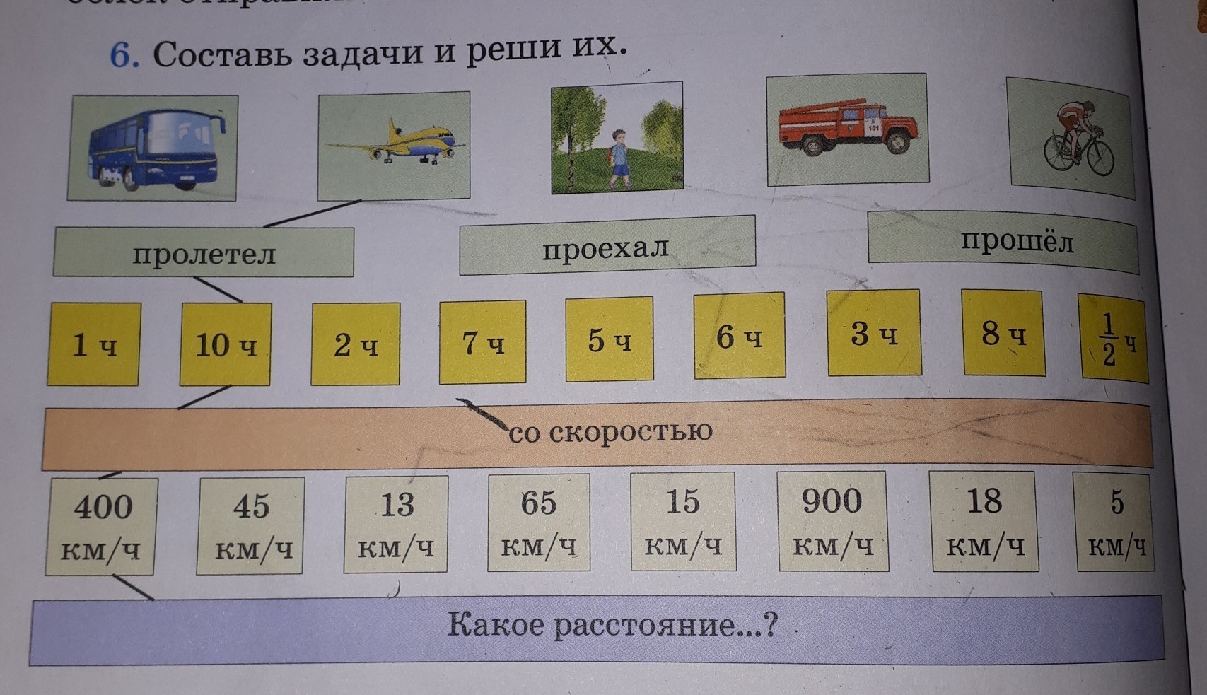1. Самолёт пролетел 10 часов со скоростью 400 км/час. Определите, какое расстояние пролетел самолёт. Решим задачу: скорость - v, время - t, расстояние - s. Расстояние вычисляется по формуле: s=vt. Подставим числа и полуим s=400×10=4000 км.