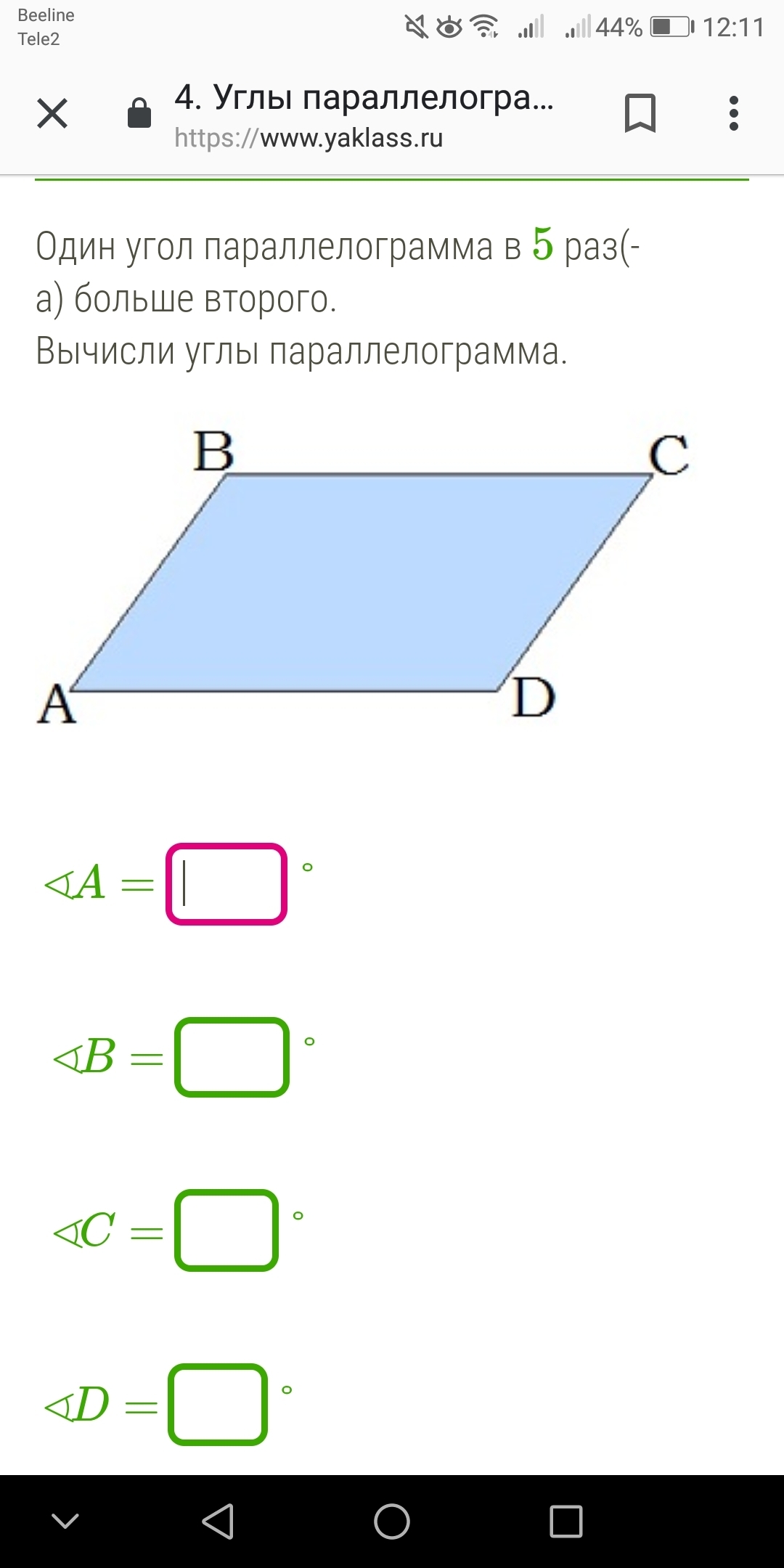 Следовательно угол B и D равны 30 градусов а угол A и C равны 30 х 5 и равно 150 градусов