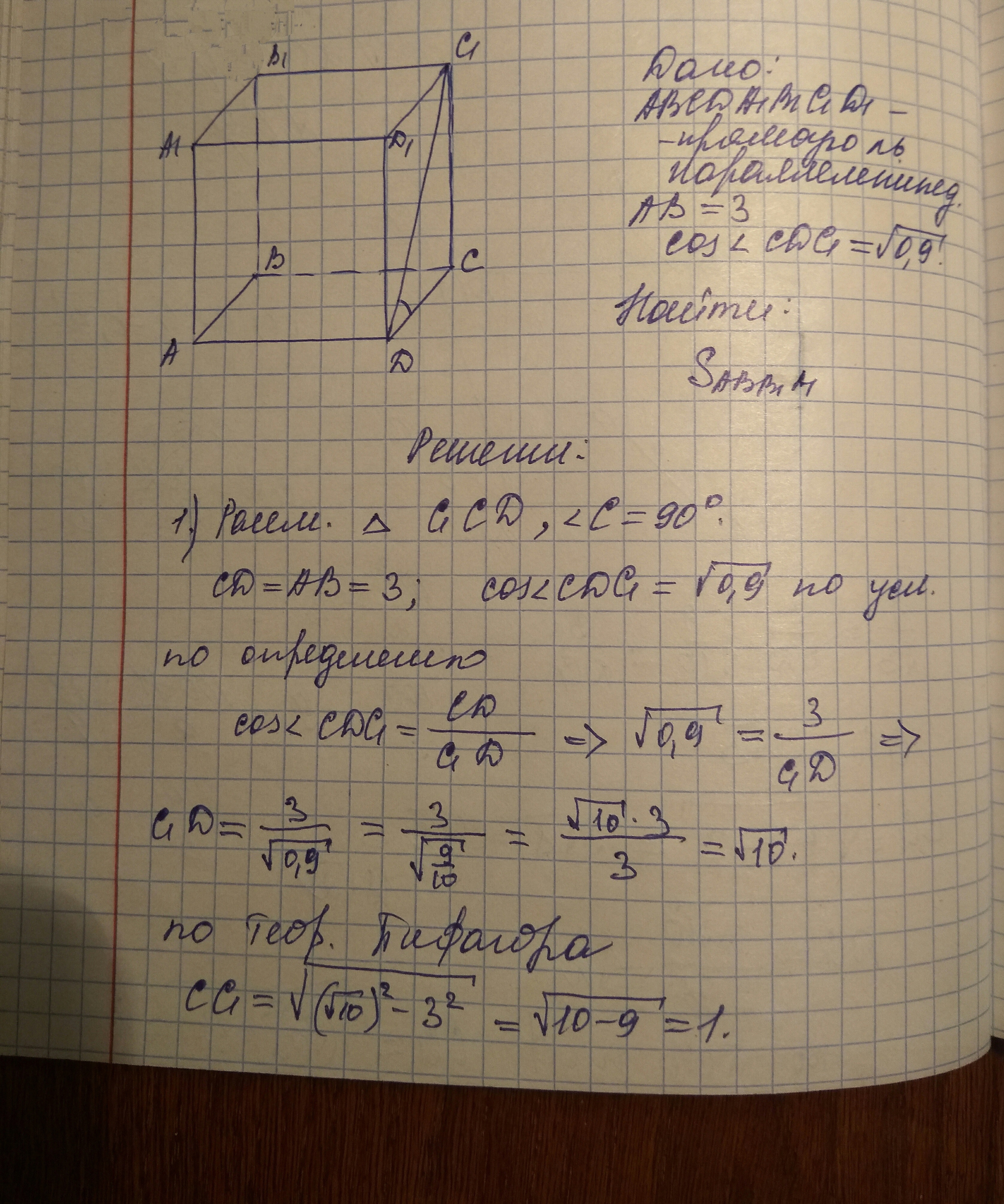 В прямоугольном параллепипеде АВСDA1B1C1D1 известно,что АВ=3 и cos угла СDC1 = корень из 0,9 .Найдите площадь грани АВВ1А1.