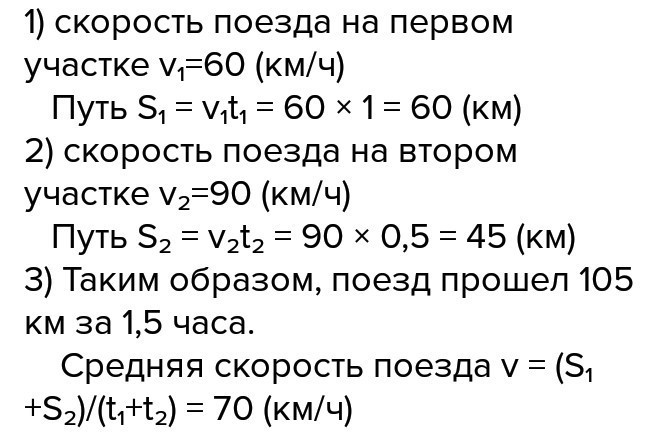 Поезд за 1 ч прошол 60 км.затем он ехал еще 30 мин со скоростью 90 км/ч. Определить среднюю скорость движения поезда