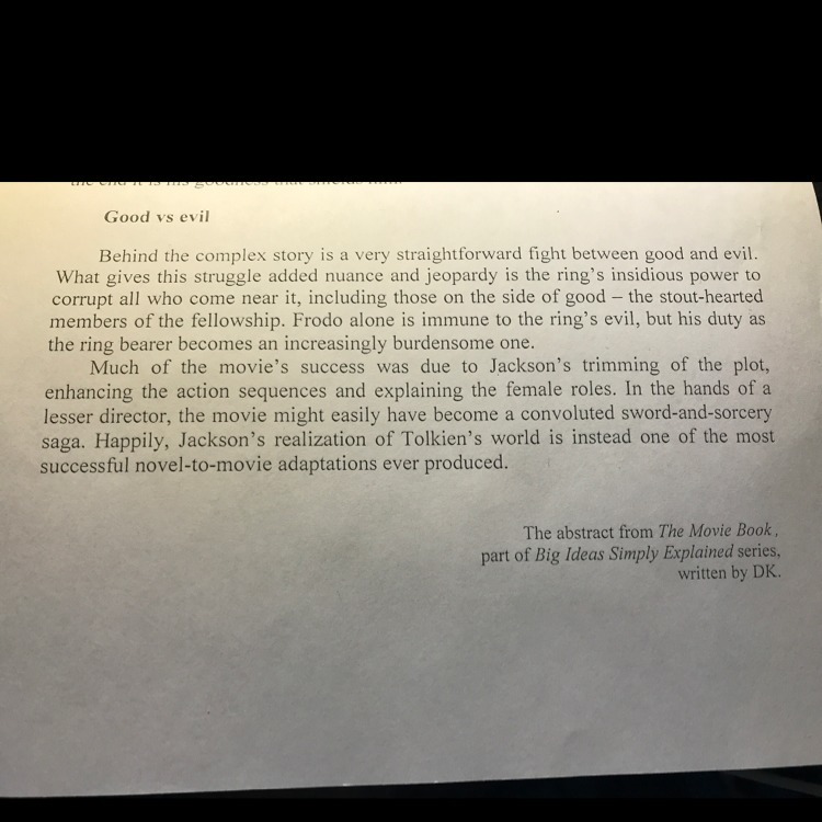 За сложной историей стоит очень откровенная битва. Доброе и злое. Что добавляет эта борьба. Нюанс и угроза - это коварная сила кольца, чтобы коррумпировать всех, кто приближается к ней, в том числе тех, кто стоит на стороне доброго - искренние члены товарищества , Только Фродо невосприимчив к злобному кольцу, но его обязанность как носителя кольца становится все более обременительной. Большая часть успеха фильма была связана с обрезкой сюжета Джексона, улучшением последовательности действий и объяснением женских ролей. В руках меньшего режиссера фильм, возможно, легко превратился в извилистую сага о мечом и волшебстве. К счастью, реализация Джексоном мира Толкина - это одна из самых успешных адаптаций от новичка к фильму, когда-либо созданных.