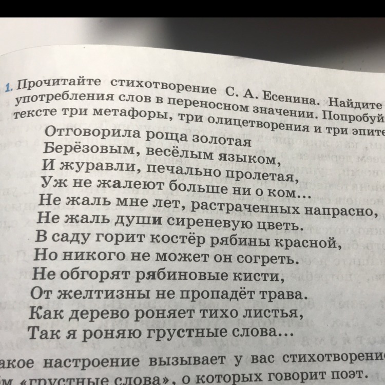 Эпитеты: роща золотая, берёзовый, весёлый язык, сиреневую цветь, грустные слова, рябина красная