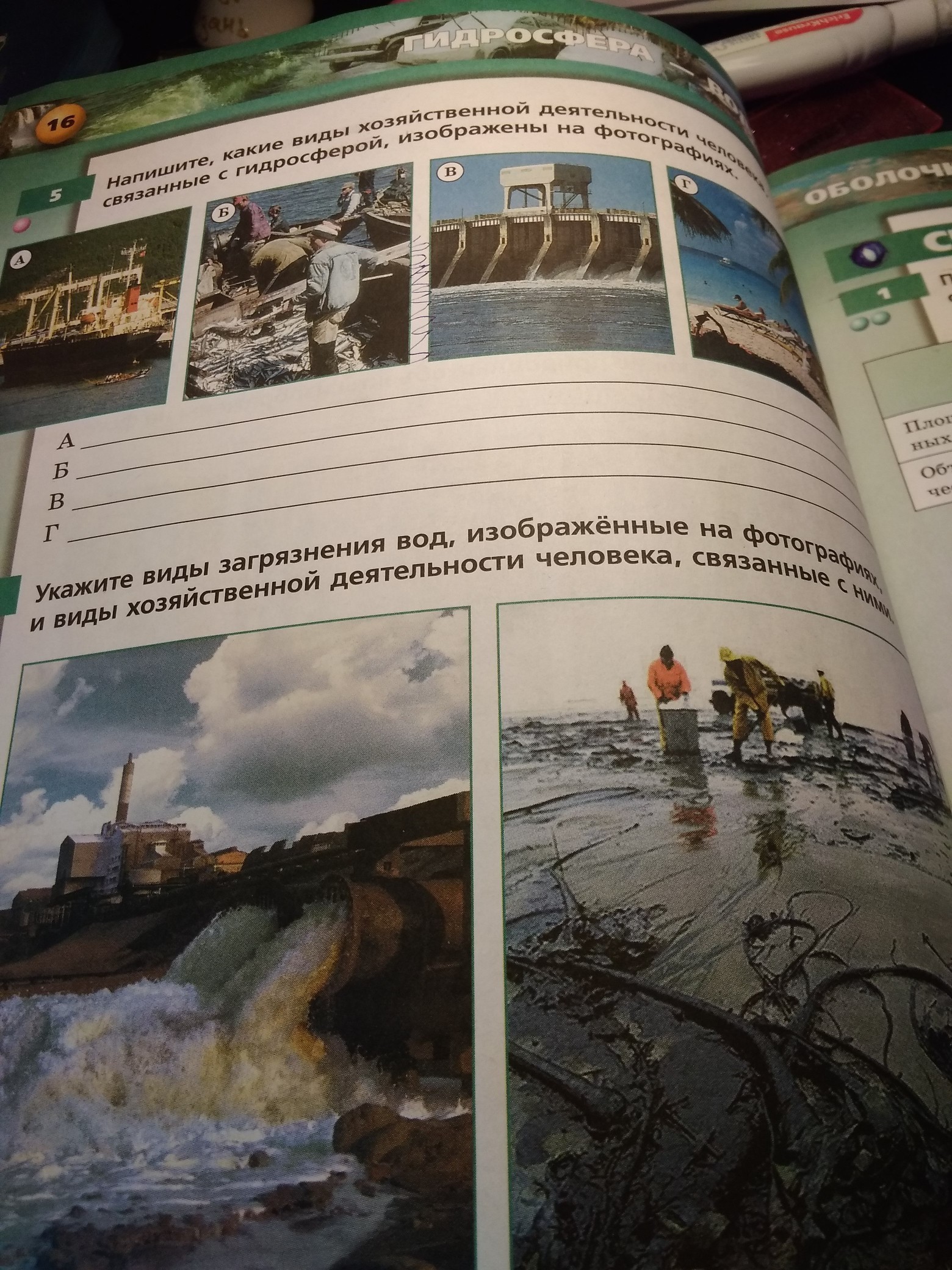 Укажите виды загрязнения вод, изображенные на фотографиях, и виды хозяйственной деятельности человека, связанные с ними.