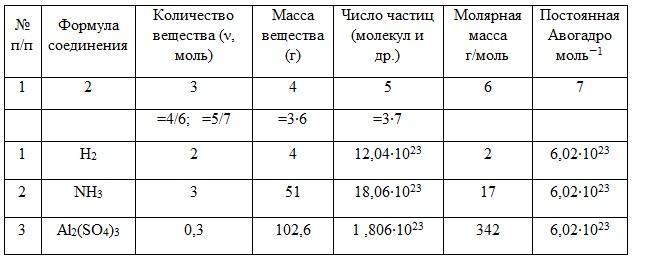 заполните таблицу в тетради формула соединения 1. h2 количество вещества 2 моль масса вещества число частиц 2. NH3 количество вещества масса вещества 51г число частиц 3. AI2(SO4)3 количество вещества масса вещества число частиц 1,806*10^23 там дальшше есть но я не писал пожеласто сделайте это по химии 8 класс поже