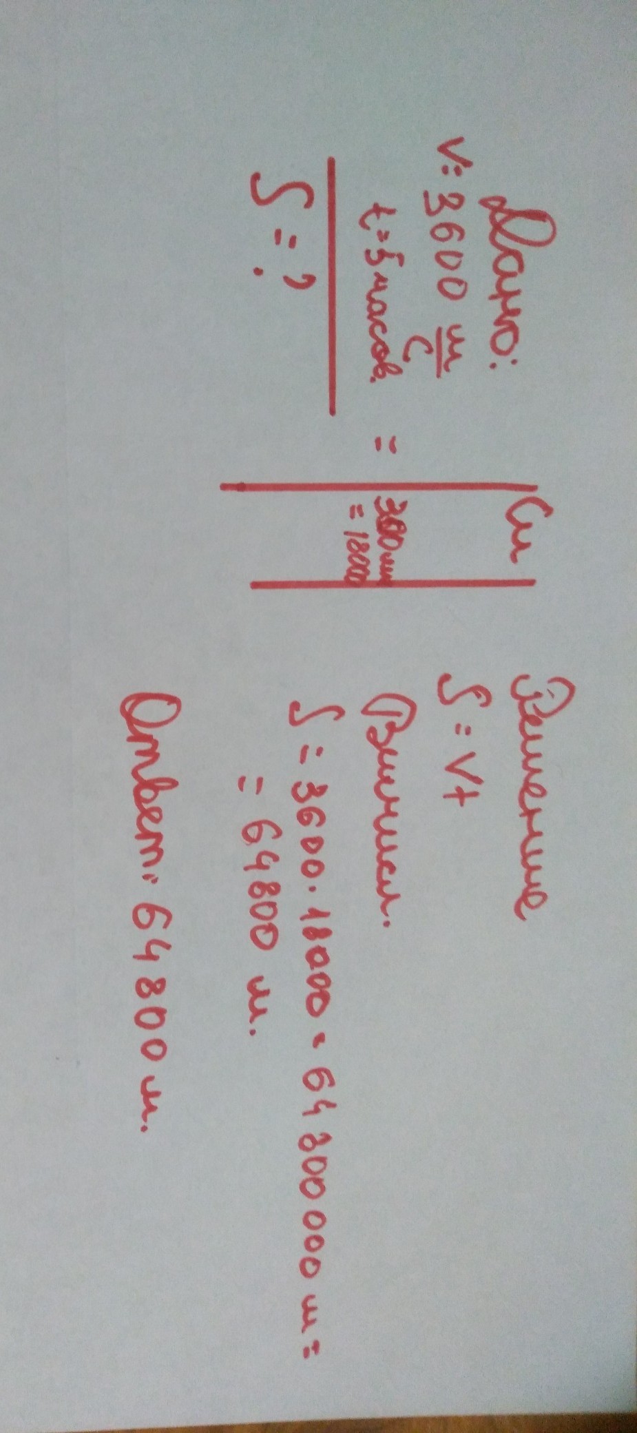 Реактивный истребитель летит со скоростью 3600 м.с какой путь он пролетит за 5 часов. Указать в км?