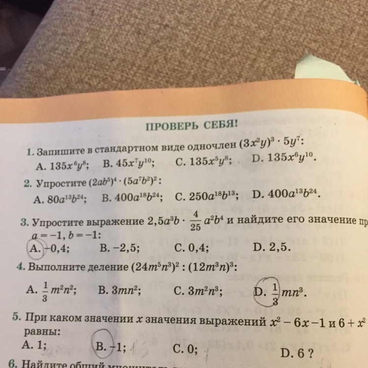 1)(3 {x}^{2} y) {}^{3}  \ 9x {}^{6} y {}^{3}  times 5y {}^{7}  \  9x {}^{6} 5y { }^{10}  \ 45x^{6} y^{10}