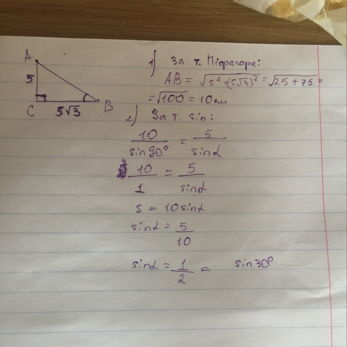 Катеты прямоугольного треугольника равны 5корень из 3 и 5. Найдите синус наименьшего угла этого треугольника