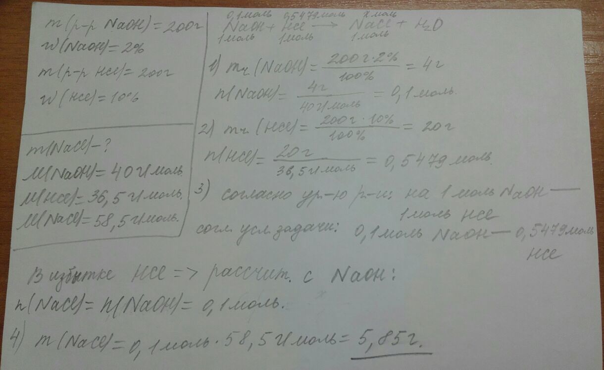 Сколько граммов соли образуется при взаимодействии 200 гр 2% раствора NaOH с 200 гр 10% раствора HCl