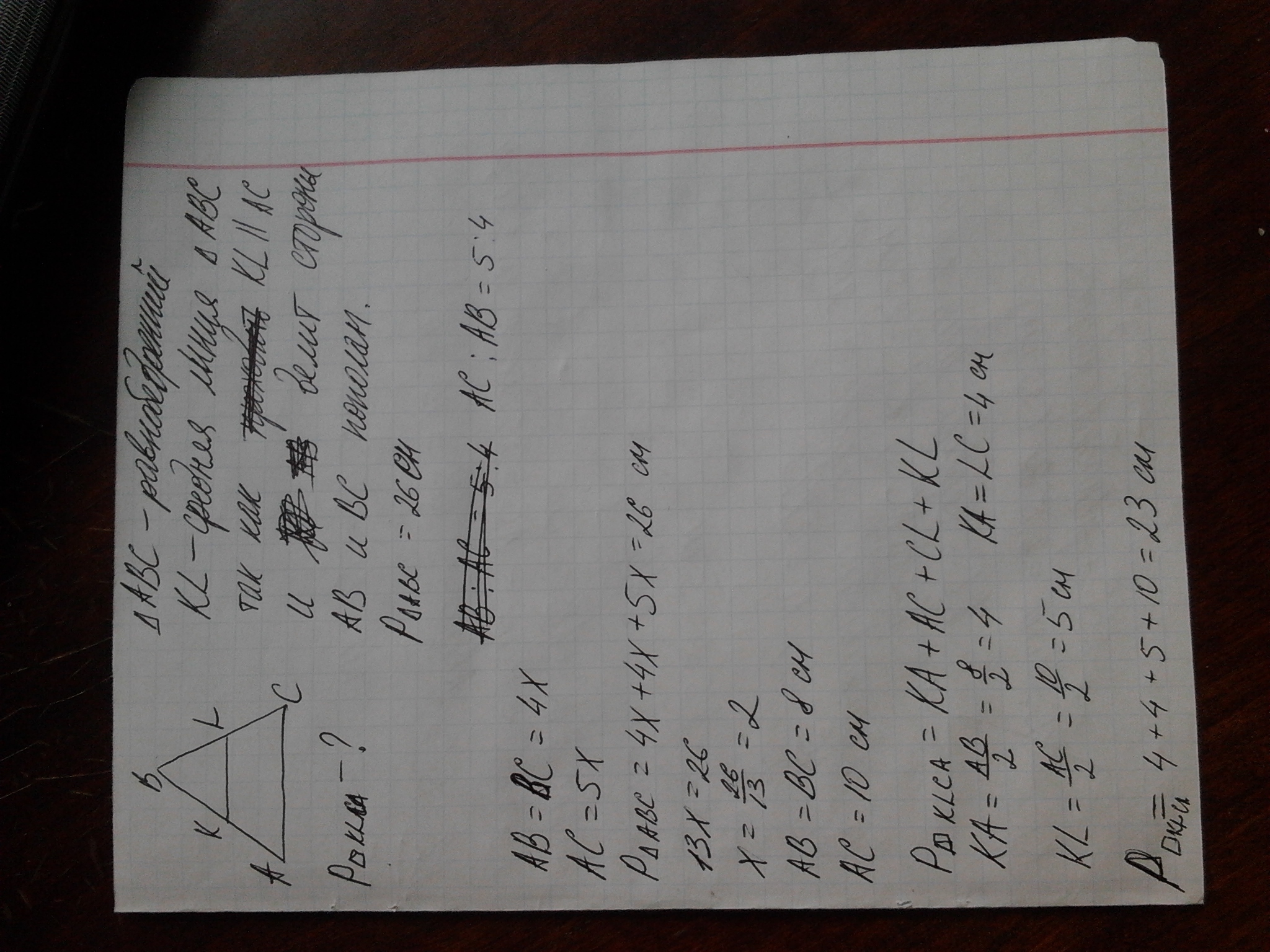 прямая параллельна основанию равнобедренного треугольника и проходит через середину боковой стороны, отсекает от данного треугольника трапецию. Найдите ее периметр, если периметр данного треугольника 26см, а аснование относится к боковой стороне как 5:4