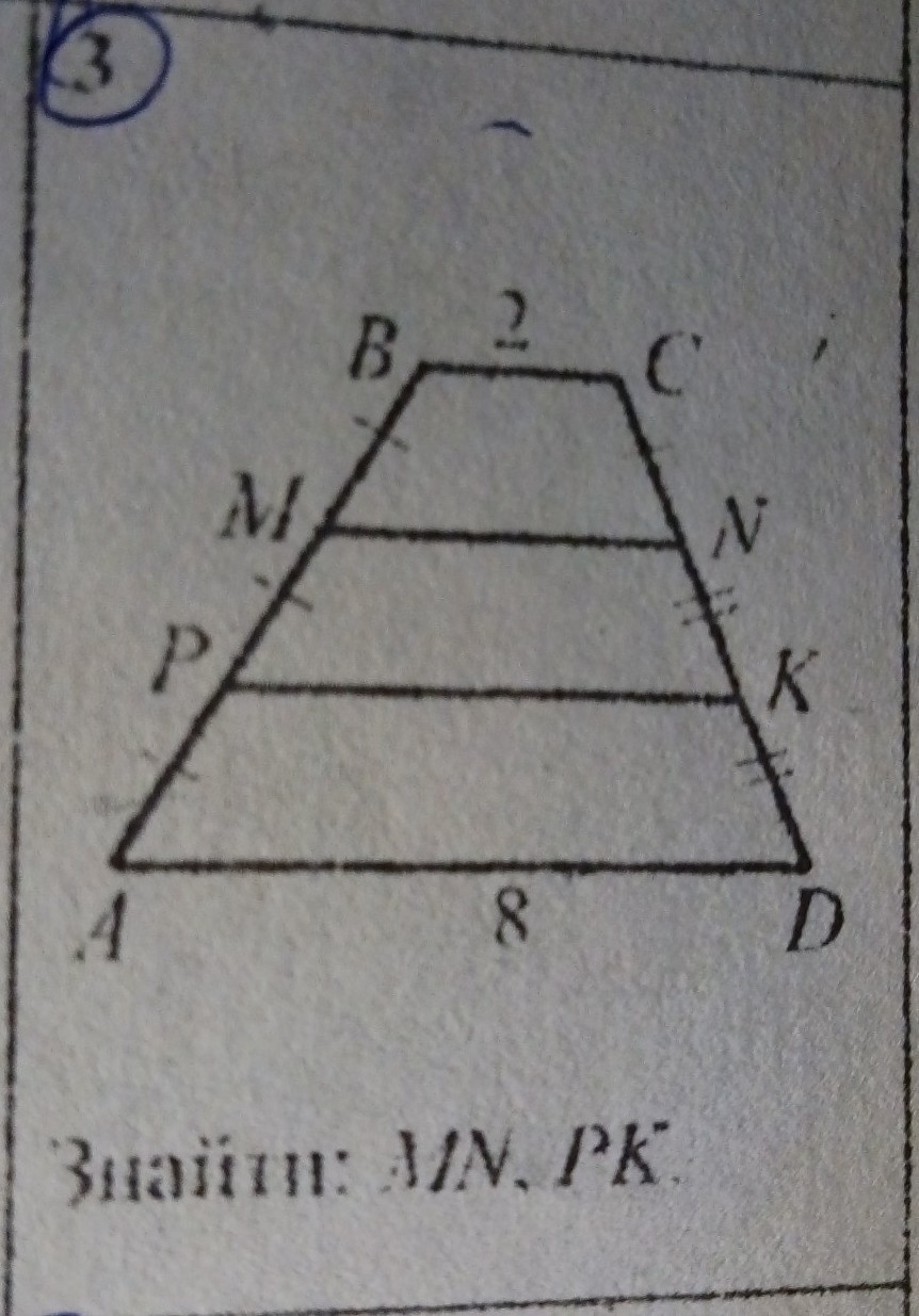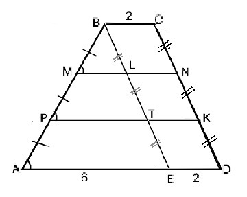 РК соединяет середины боковых сторон трапеции AMND ⇒ РК – её средняя линия и равна полусумме МN+AD=(4+8):2=6