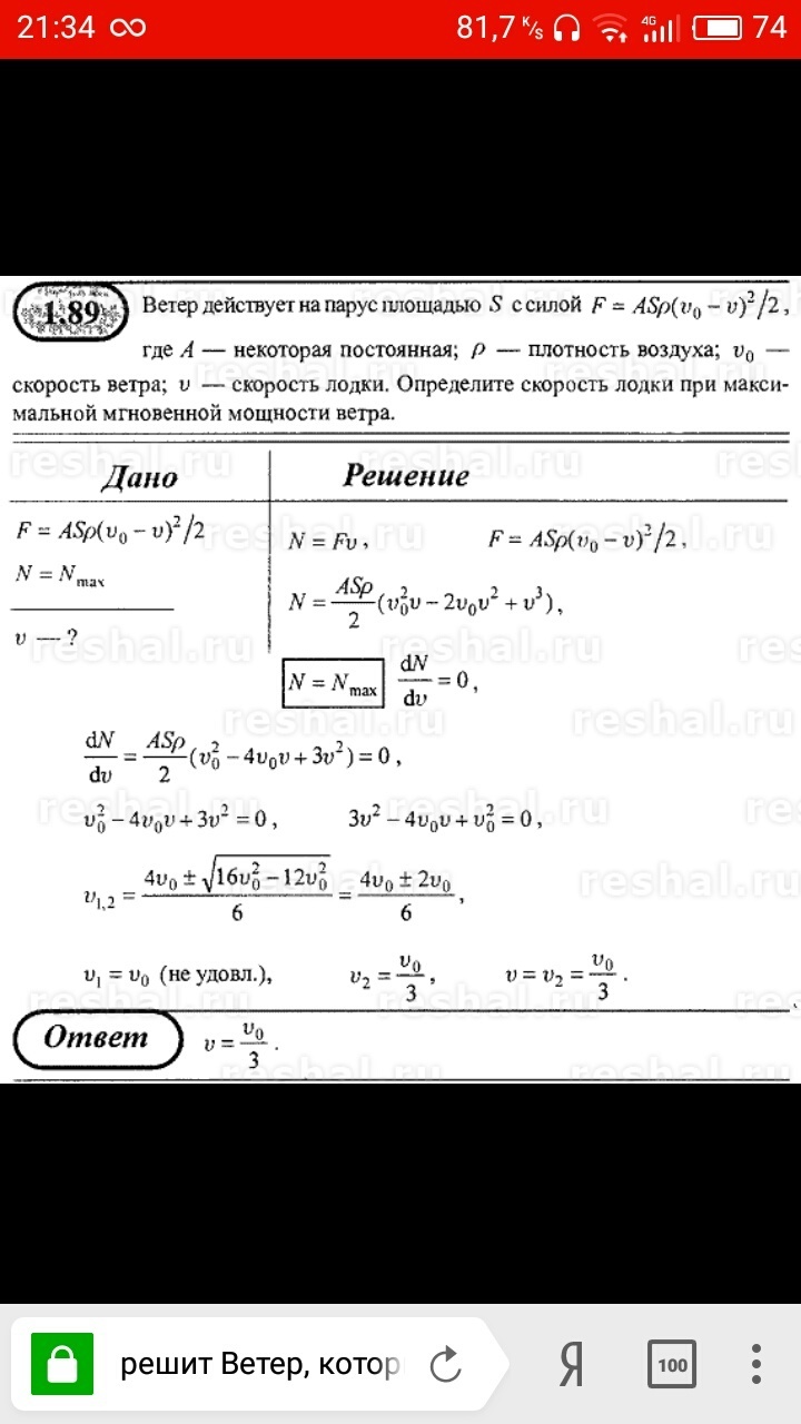 Ветер, который дует со скоростью V0 = 20 м / с, действует на парус площадью S = 25 м ^ 2 с силой F = S ρ( (v0 - v) ^2)/2, где ρ - плотность воздуха, v - скорость парусника. Определить скорость парусника, при которой влияние ветра является максимальным.