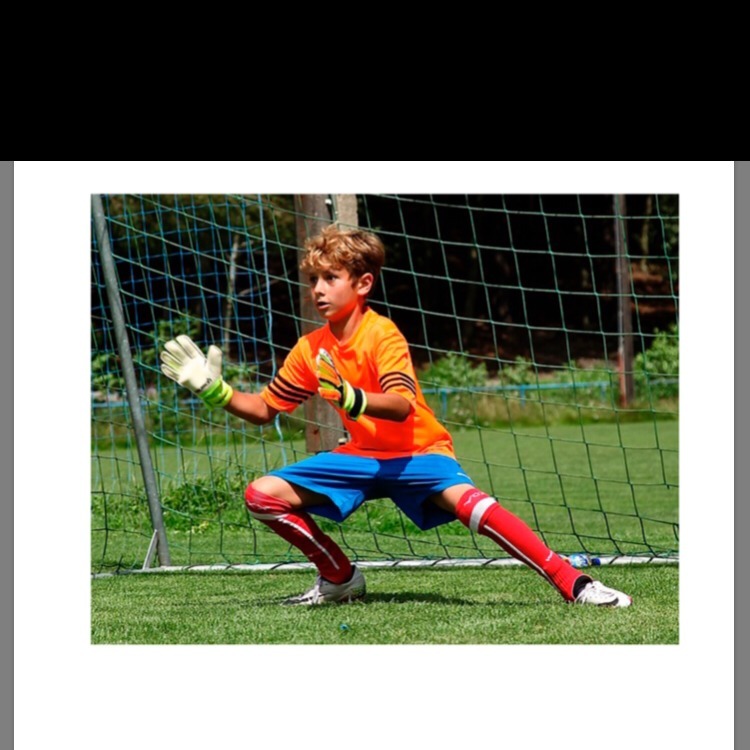На фотографии изображён мальчик,который стоит на воротах.На мальчике оранжевая футболка,синие штаны,белые перчатки,красные носки,белые кроссовки.Он ловит мяч.На заднем плане стоят ворота.