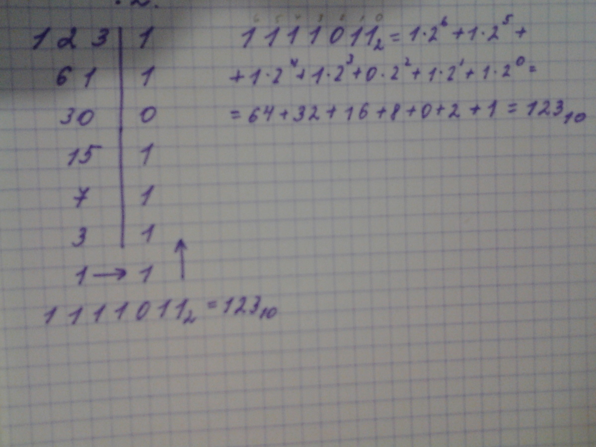 Для перевод из двоичной в десятичную мы над числом начиная с правого проставляем цифры, начиная с нуля. Это будет степенью двойки, на которую будет умножаться соответствующая цифра двоичного представления числа. Просто складываем, вычисляем.