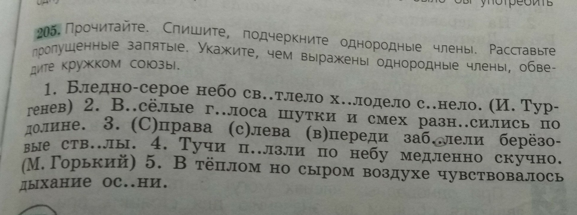1.Бледно-серое небо светлело, холодело, синело.2.Веселые голоса, шутки и смех разносились по долине.3.Справа, слева, впереди забелели берёзовые стволы.4.Тучи ползли по небу медленно, скучно.5.В теплом , но сыром воздухе чувствовалось дыхание осени.