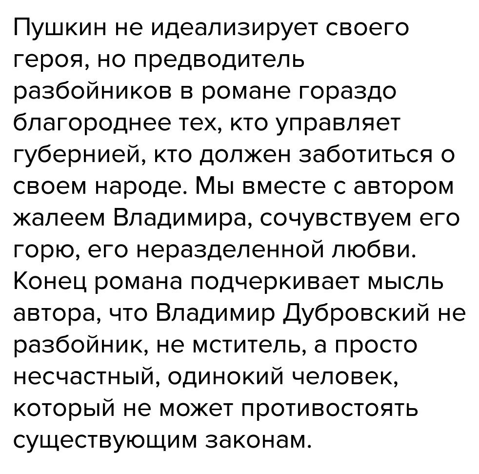 Пушкин не идеализирует своего героя, но предводитель разбойников в романе гораздо благороднее тех, кто управляет губернией, кто должен заботиться о своем народе. Мы вместе с автором жалеем Владимира, сочувствуем его горю, его неразделенной любви. Конец романа подчеркивает мысль автора, что Владимир Дубровский не разбойник, не мститель, а просто несчастный, одинокий человек, который не может противостоять существующим законам.