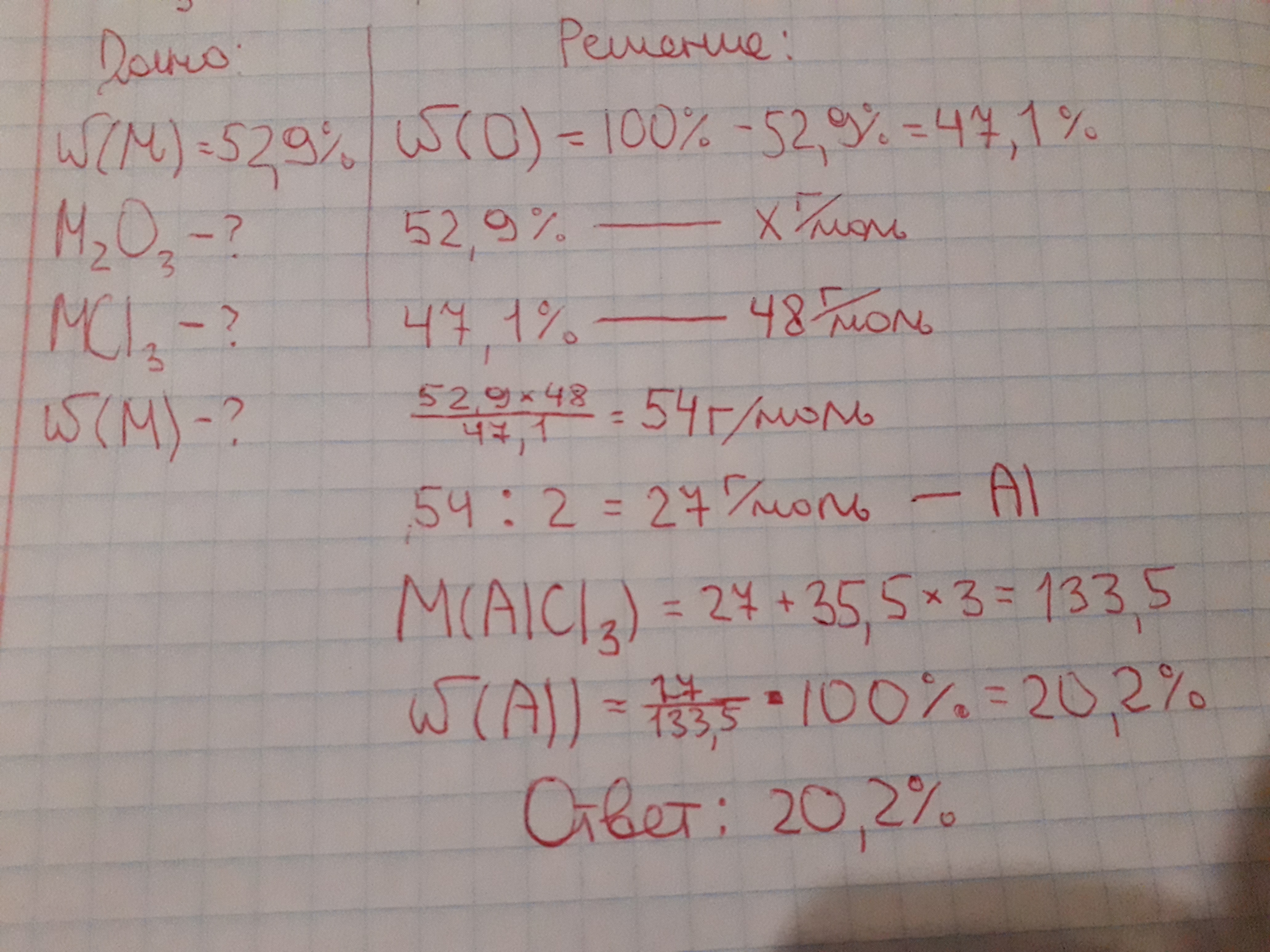 В оксиде неизвестного трехвалентного металла массовая доля металла составляет 52,9%. Найдите массовую долю этого же металла в хлориде