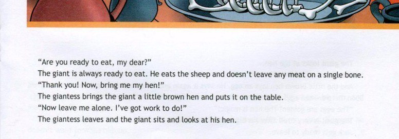 Великанда приносит гиганту маленькую коричневую курицу и кладет ее на стол.