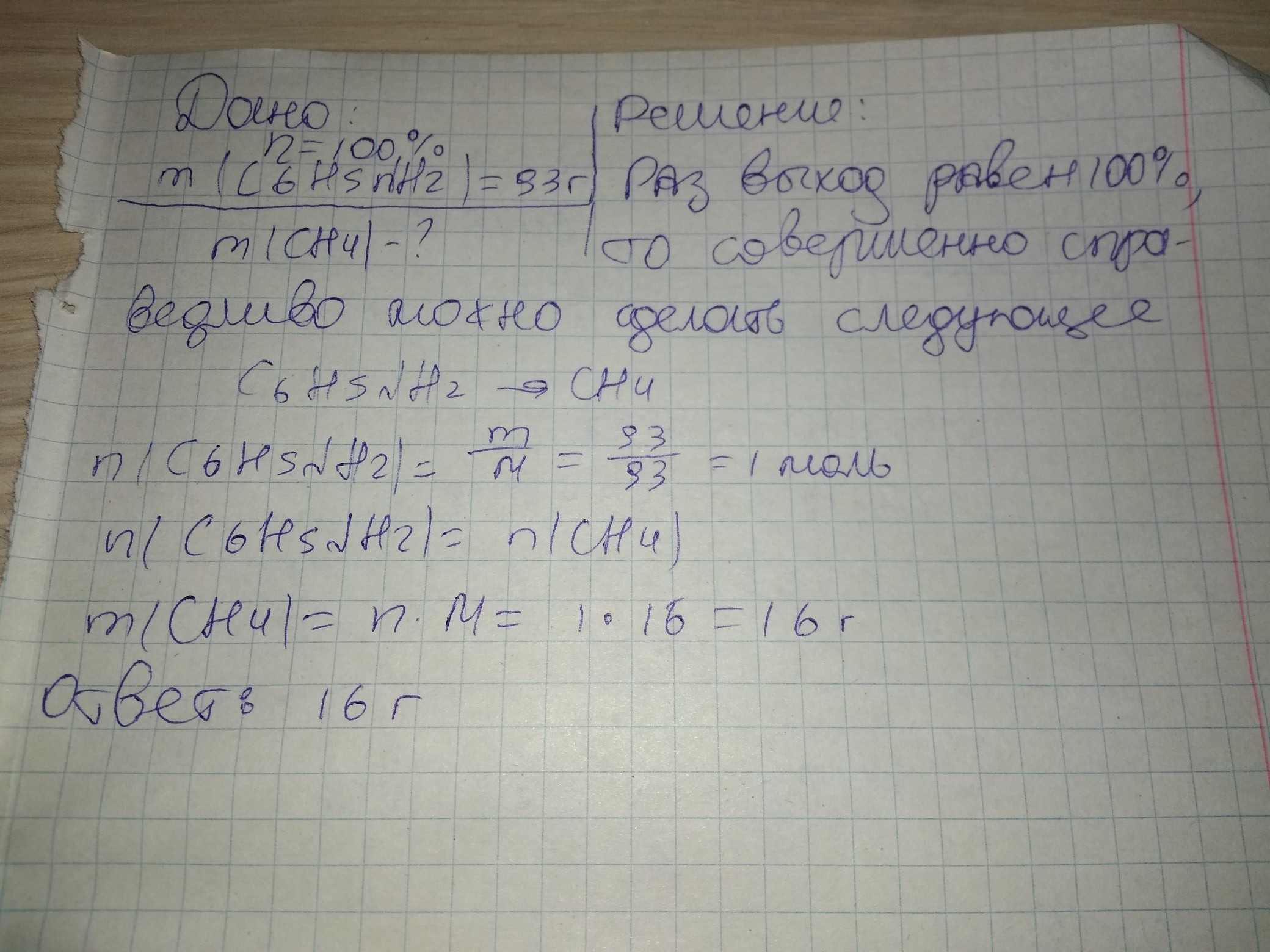 Вычислите массу метана н.у. затраченного для получения анилина массой 93г выход продукта реакции на каждой стадии 100%