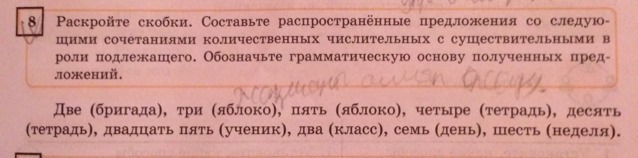 Две бригады трудились усердно.На столе лежали три яблока.Папа купил четыре тетради.В классе лежат десять тетрадей.В нашем классе учатся двадцать пять учеников.В школе числятся два первых класса.Все знают,что в неделе семь дней.Я учусь в школе уже шесть недель.