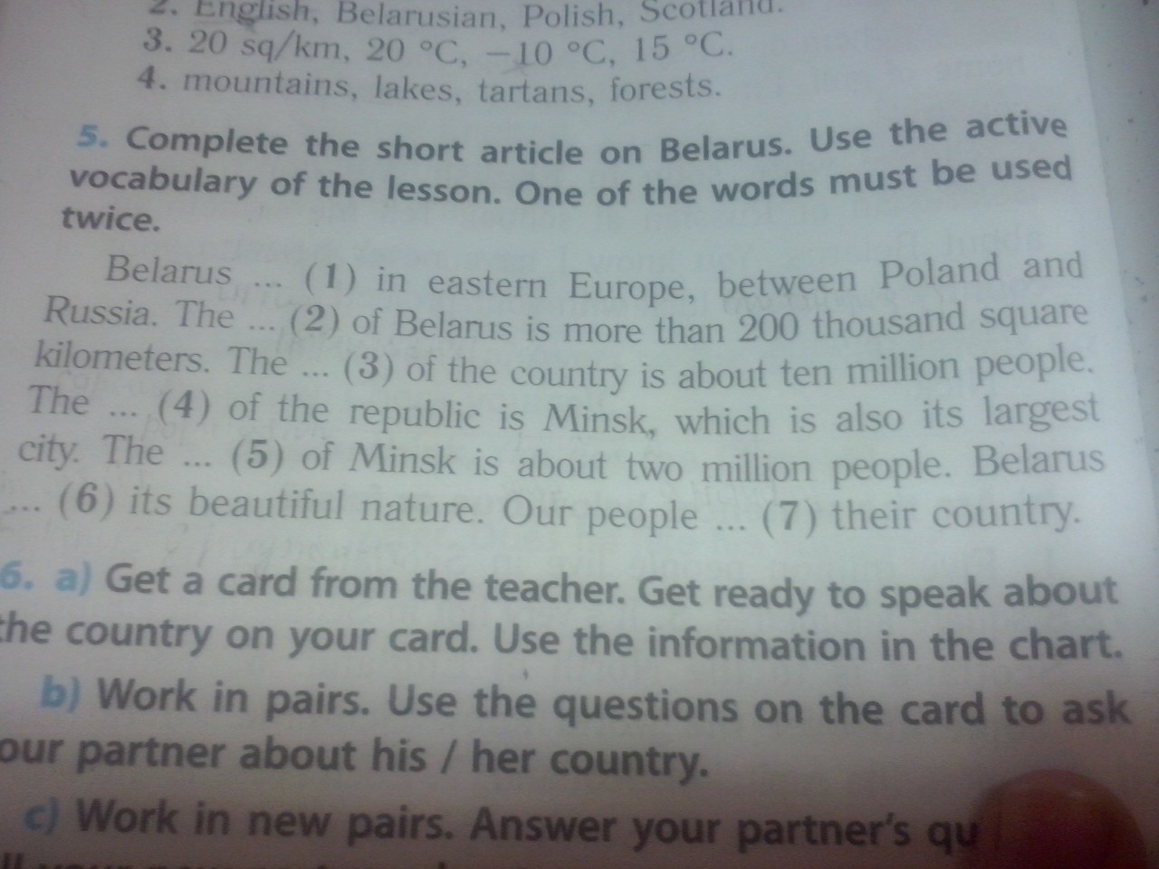 Беларусь (1) в Восточной Европе, между Россией. (2) Белана насчитывает более 200 тысяч квадратных километров. (3) страны составляет около десяти миллионов ... (4) республики - это Минск, который также является его крупнейшим городом. Польша и (5) из В Минске около двух миллионов человек (6) его прекрасная природа. Наши люди (7) их страна