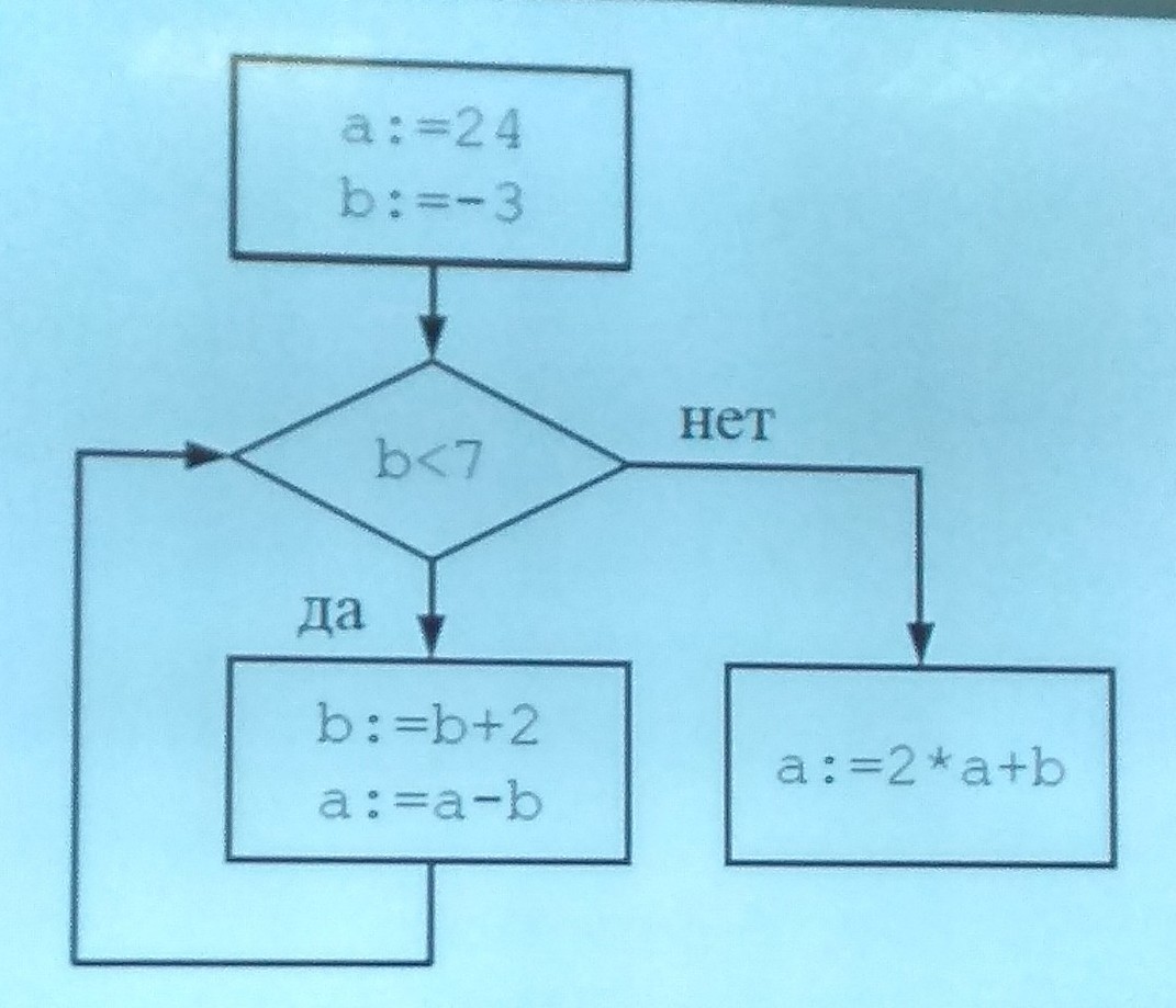 1) b < 7? да -> b := b+2 = -1; a := a-b = 24+1 = 25
