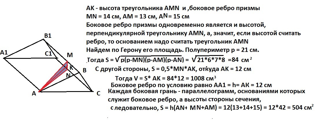 Сечением перпендикулярным к боковому ребру наклонной треугольной призмы есть треугольник со сторонами 13, 14 и 15см. Если боковое ребро призмы равно высоте сечения проведенной к стороне 14см, то чему равна площадь боковой поверхности этой призмы? Решение обязательно с рисунком.