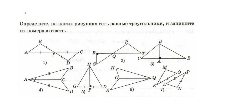 40 БАЛЛОВ! Определите, на каких рисунках есть равные треугольники, и запишите их номера в ответе.