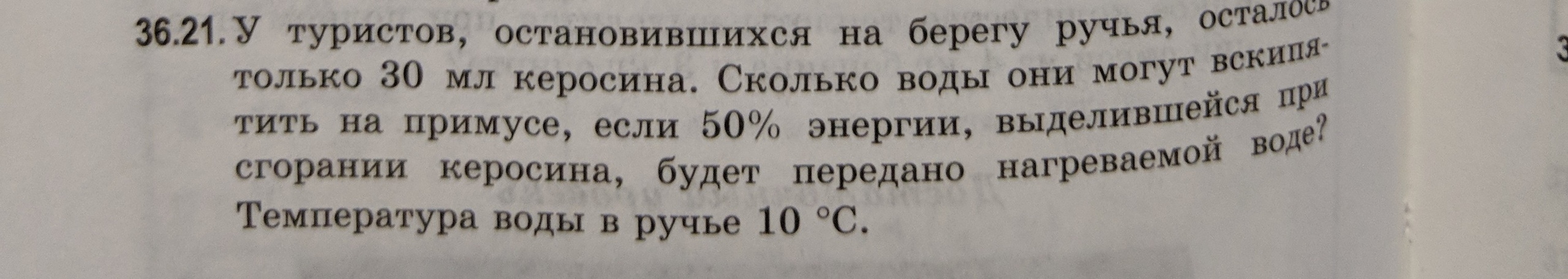У туристов, остановившихся на берегу ручья, осталось только 30 мл керосина. Сколько воды они могут вскипятить на примусе, если 50% энергии, выделившейся при сгорании керосина, будет передано нагреваемой воде?