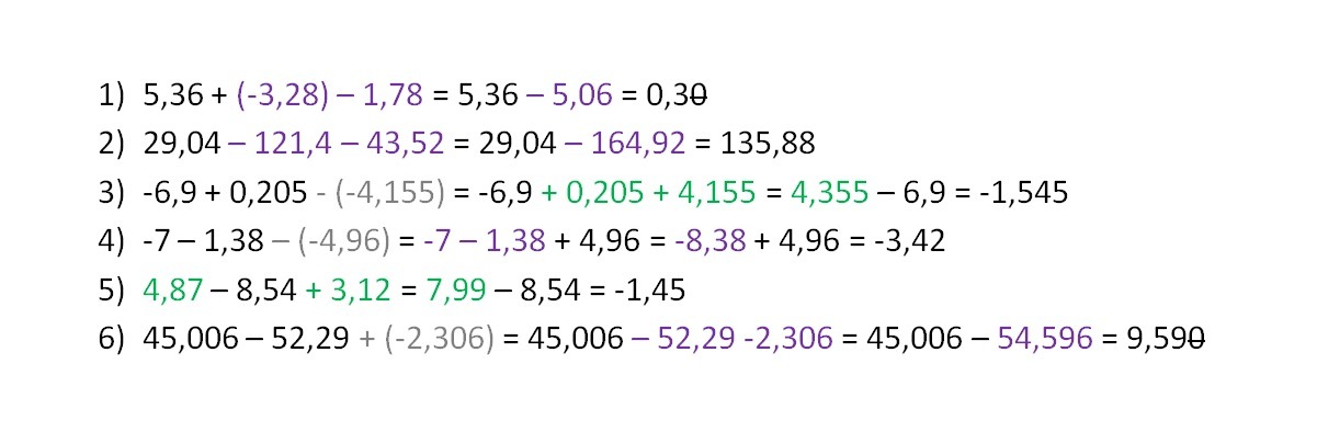 Все примеры с решением. Некоторые числа разукрашены в разноцветные цвета: фиолетовый, зелёный, серый и голубой. Это зависит от вида их действий. Числа, закрашенные зелёным цветом, это числа, которые складываются. В следующем пункте выявляется их сумма. Например: 4,87 – 8,54 + 3,12 = 7,99 – 8,54 = -1,45. Если фиолетовым цветом, то это действия только с отрицательными значениями. Серым цветом указываются числа в скобках и знак пред ним. Это означает, что прежде всего они раскрываются, а уж потом идут действия. На этом упражнение заканчивается. Счастливо!
