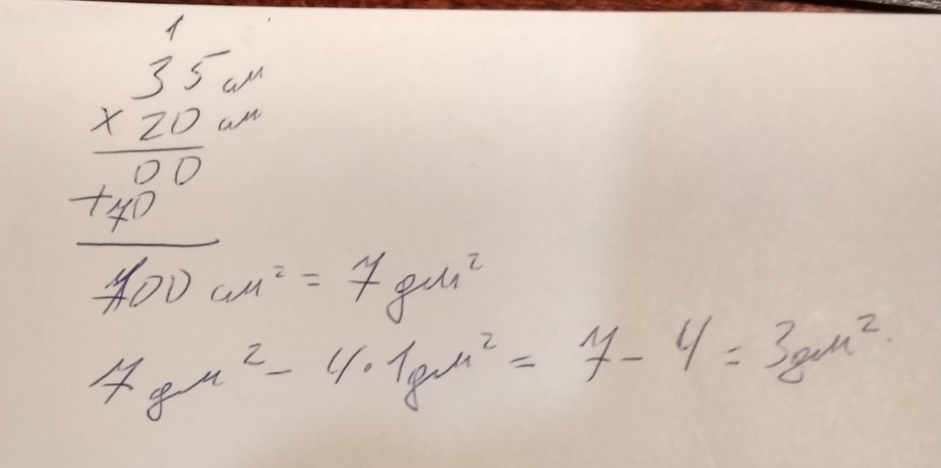 Из листа картона длинной 35см и шириной 20см Маша вырезалачетыриквадрата площадью 1 квадратный дм каждый. Найди площадь остатка картона. Ответ вырази в квадратных дм.
