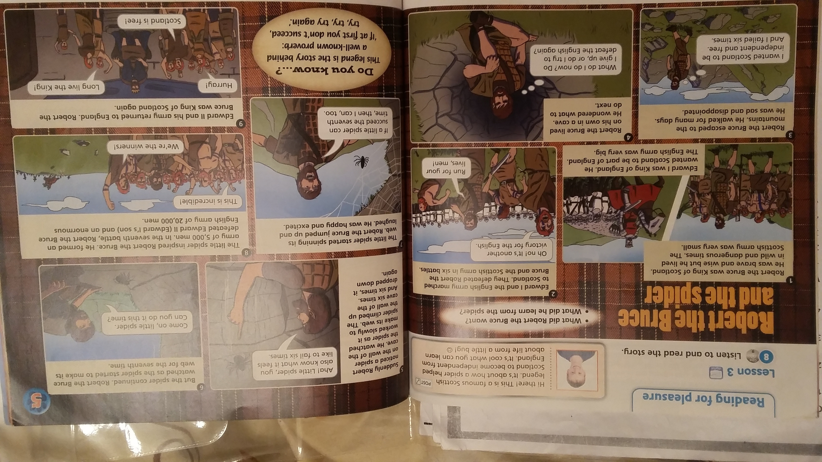 армия пошла в Шотландию. Брюс и шотландская армия в шести битвах Брюс был королем Шотландии. был смелым и мудрым, но жил в дикой и опасной времени. Шотландская армия была очень маленькой. Ах, ну, это еще одна победа для английского языка. Беги за свои жизни, мужчины Эдвард Я был королем Англии. Он хотел, чтобы Шотландия была частью Англии. Английская армия была очень большой. 4 Роберт Брюс бежал в горы. Он ходил много дней. Он был печален и разочарован. Роберт Брюс жил у себя в пещере. Он интересовался, что делать дальше, я хотел, чтобы Шотландия была независимой и свободной. И я проиграл шесть раз Что я сейчас делать? Или я отказываюсь, или попробую победить английский снова?