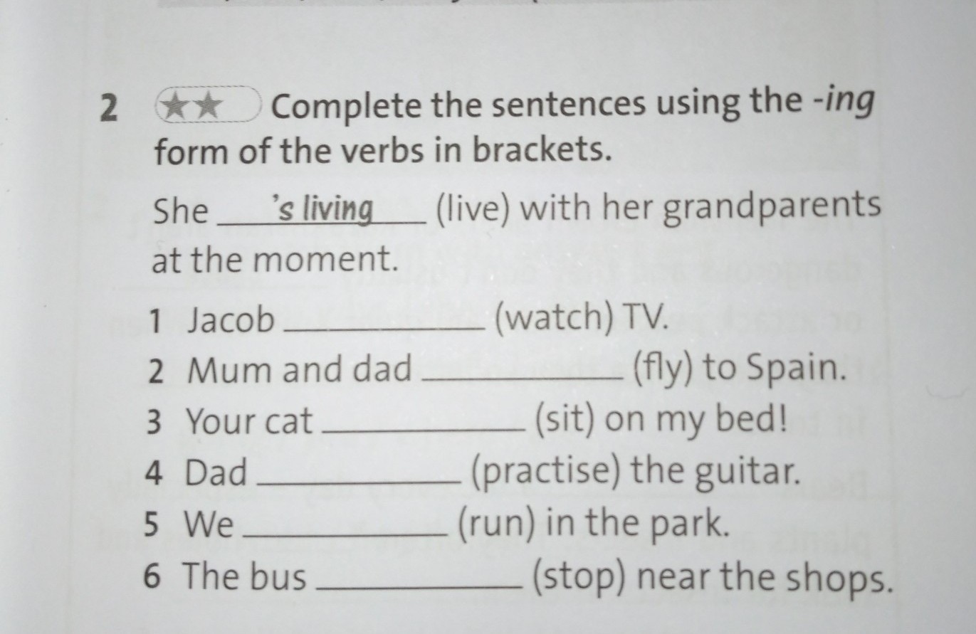 1. Jacob is watching TV. 2. Mum and dad are flying to Spain. 3. Your cat is sitting on my bed! 4. Dad is practising the guitar. 5. We are running in the park. 6. The bus is stopping near the shops.