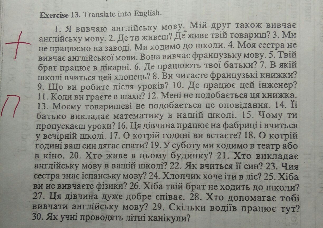 Exercise 13. Transiate into English 1. I study English . My friend raron learning not working at the factory. We go to school . 4. My brother is English. 2. Where do you live? Where your friend lives ? Q. We do not study English as a sister. She is studying French . S. Your work in the hospital. 6. Where do your parents go? 7. In what school does 1 boy learn? 8, do you read French books? 9 what do you do after classes? 10. Where does this engineer work? 11. When you play chess? 12. I do not like this book 13. My friend does not like this story, 14. My father will describe mathematics at our school. 15. Why do you miss the lessons? 16. This girl works at the factory and studies at the evening school. 17. What time do you get up? 18. At what time does your sleep go to bed? 19. On Saturday we go to the theater or to the cinema. 20. Who lives in this house? 21. Who teaches English at your school? 22. How does her son study? 23. Does sister know the Spanish language? 24. Does the boy want to go to the woods? 25. Do not you study physics? 26. Does your brother go to school? 27. This girl is singing well 28. Who helps you learn English? 29. How many drivers works here? 30. Students spend their holidays