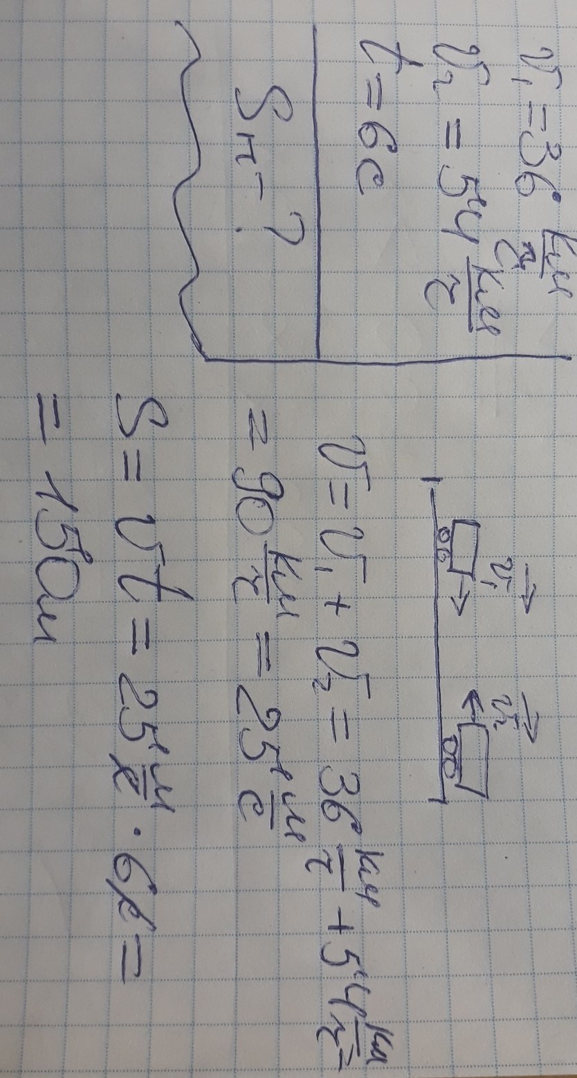 Два потяги рухаються назустріч один одному. Швидкість першого потягу дорівнює 36км/год, другого 54км/год. Пасажир першого потяга помічає, що другий потяг проходить повз нього за 6с. Визначте довжину другого потяга.