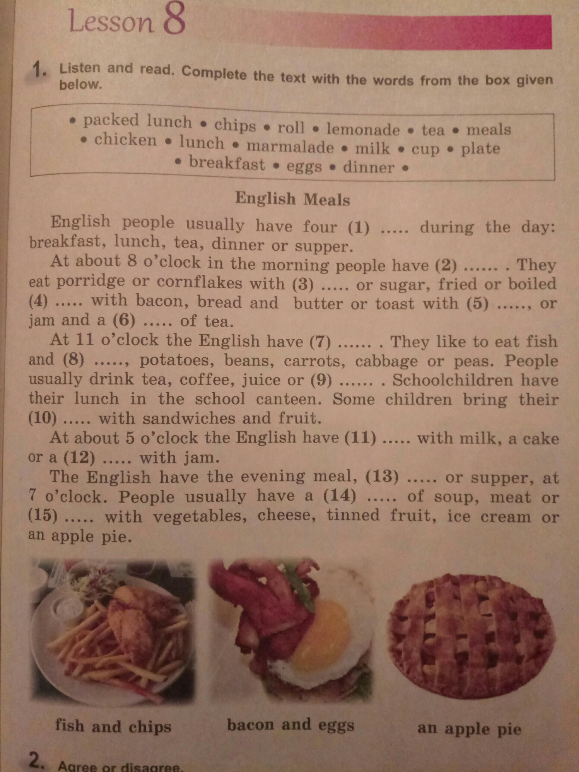 10 packed lunch. 8 chips. 12 roll. 9 lemonade. 11 tea. 1 meals 15 chicken. 7 lunch. 3 marmalade. 8 milk. 6 cup. 14 plate. 2 breakfast • 4 eggs • 13 dinner •