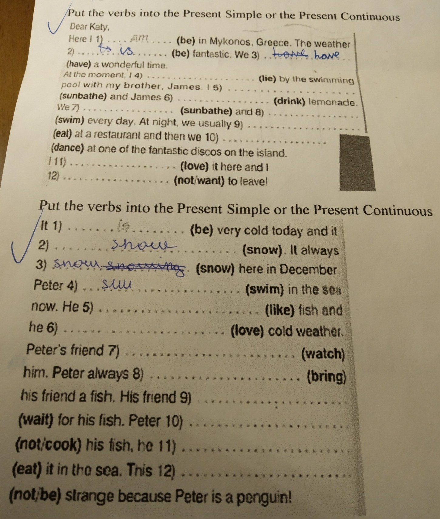 am, is, are having (ing потому что have a great time - устойчивое выражение), am lying, am sunbathing, is drinking, sunbathe, swim, eat, dance, love, don't want