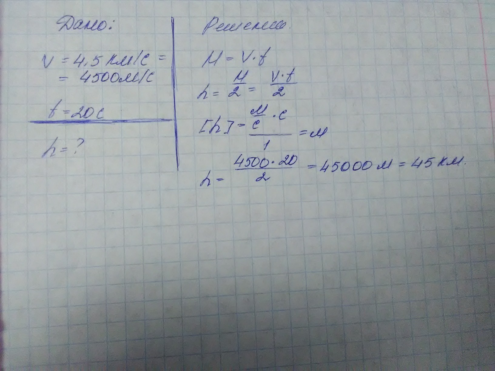 В результате взрыва, произведенного геологами, в земной коре распространилась волна со скоростью 4,5 км/с. На какой глубине залегает порода другой плотности, если отраженная от нее волна была зафиксирована на поверхности через 20 с после взрыва?