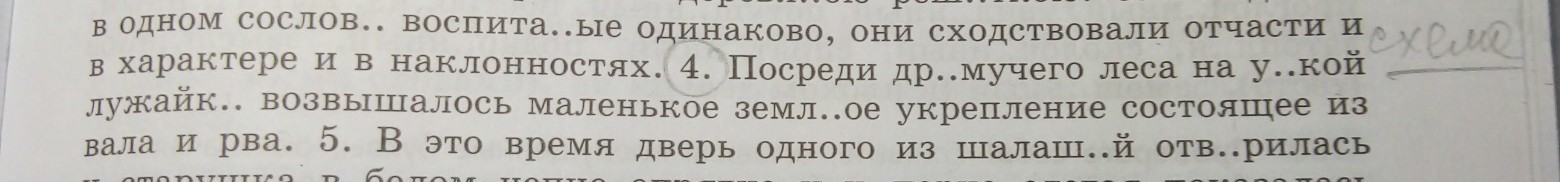 Посреди дремучего (дремлет) леса на узкой (узенький) лужайке (п.падеж) возвышалось маленькое земляное (суф.ян) укрепление, состоящее из вала и рва.