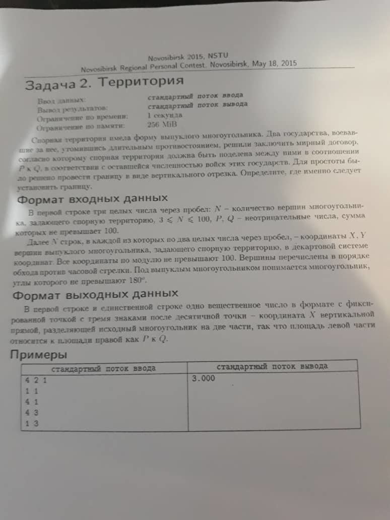 Спорная территория имела форму выпуклого многоугольника. Два государства, воевавшие за нее, утомившись длительным противостоянием, решили заключить мирный договор,согласно которому спорная территория должна быть поделена между ними в соотношении, в соответствии с оставшейся численностью войск этих государств. Для простоты было решено провести границу в виде вертикального отрезка. Определите, где именно следует установить границу