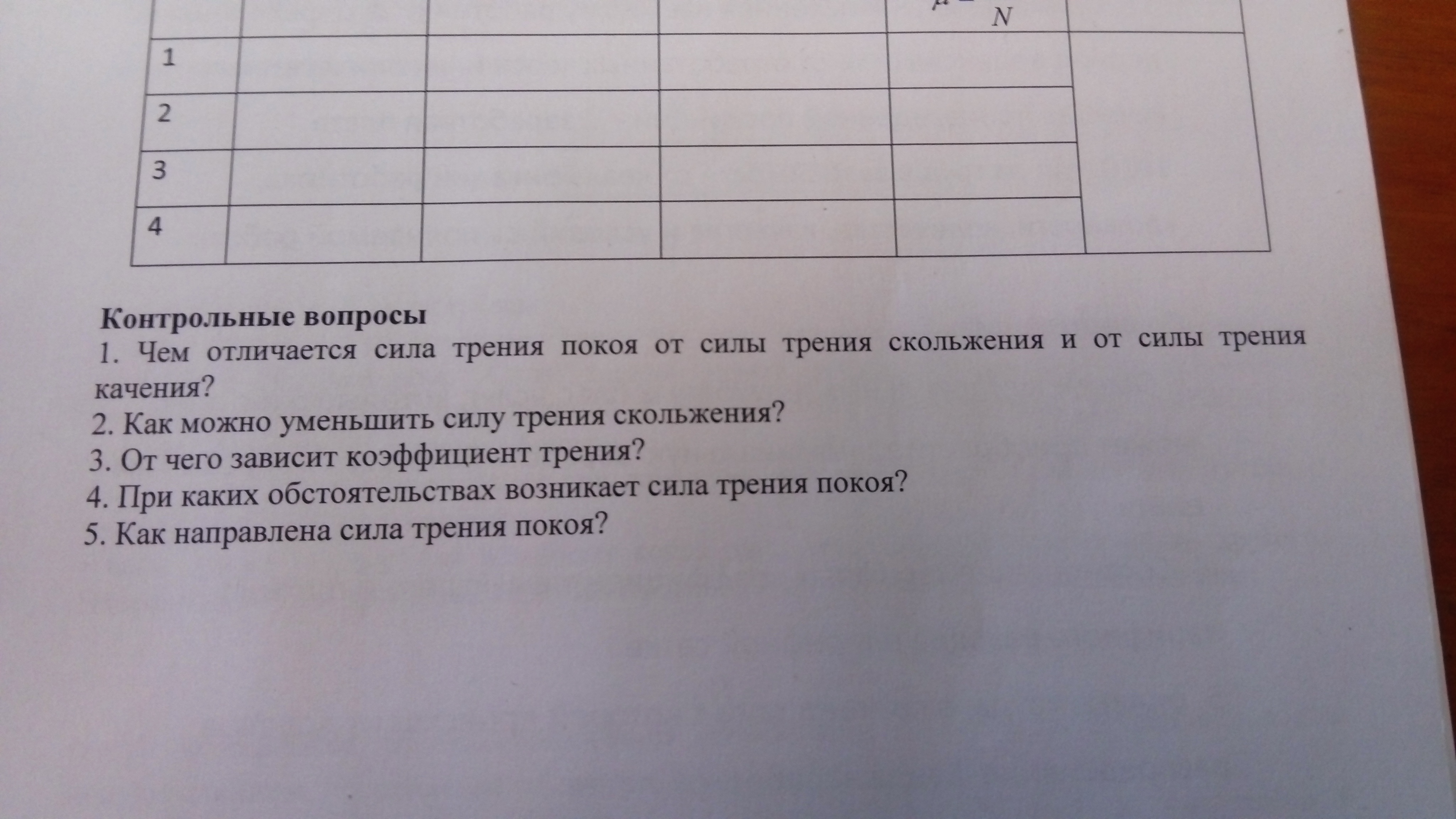 4)Сила трения возникает при непосредственном соприкосновении тел и всегда направлена вдоль поверхности соприкосновения. Сила трения покоя возникает когда к покоящемуся телу прикладываем некоторую силу F не приводящую тело в движение.