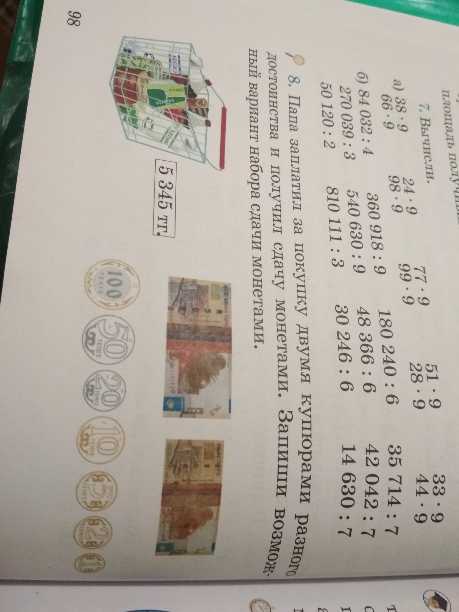 папа заплатил за покупку двумя купюрами разного достоинства и получил сдачу монетами. Запиши возможные варианты набора сдачи монетами