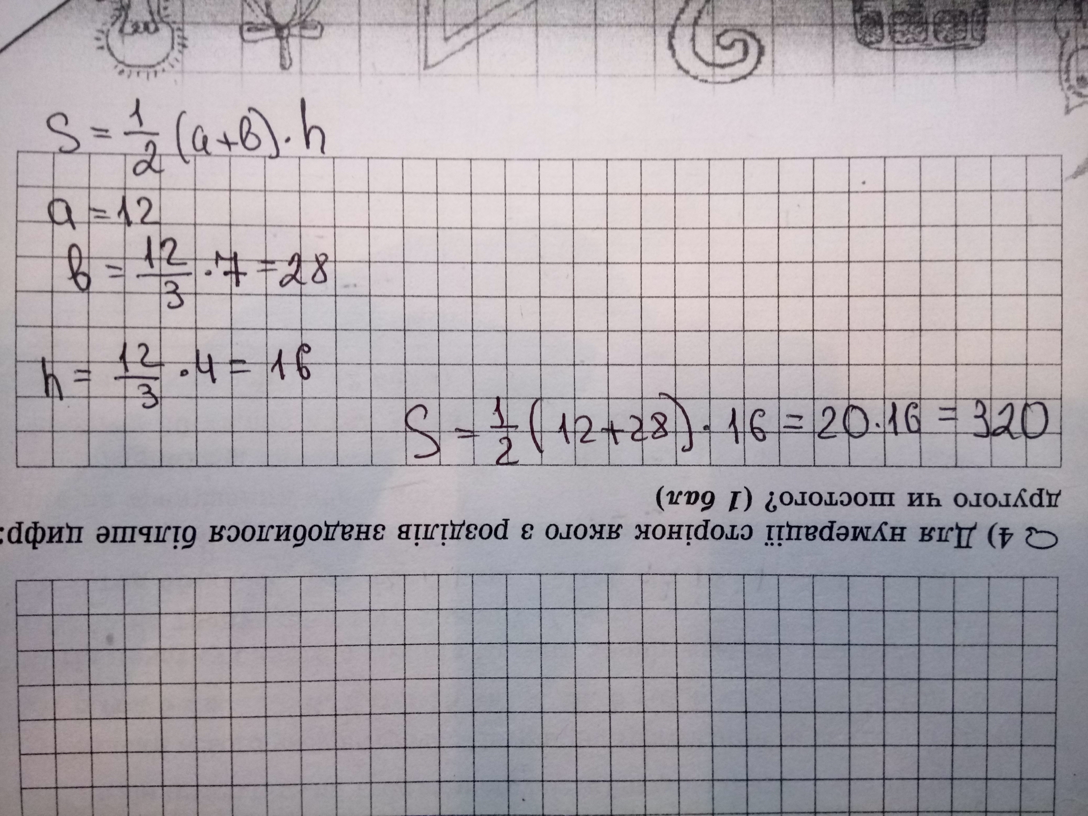 Я решила, как для 8-9кл. Для 7-го кл. 1 кл. это 4х4. (12/3=4). Крайние треугольники если сложить, получаем прямоугольник со сторонами 8 на 16, а в середине 12 на 16. 8*16+12*16=320