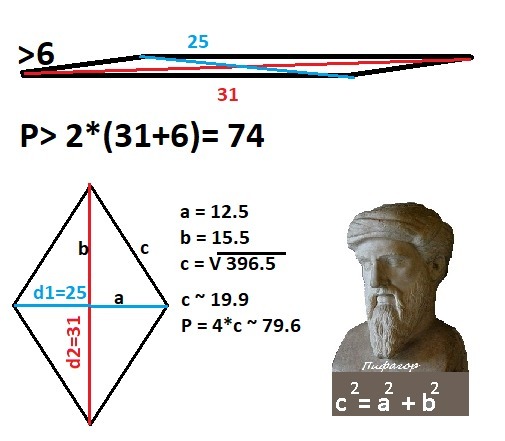 10. Диагонали четырехугольника равны 25 см и 31 см. Найдите периметр четырехугольника, вершины которого являются серединами сторон данного четырехугольника.