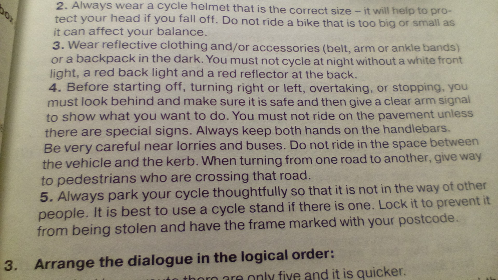 4.Перед началом : поворота налево или направо обгона или остановки ты должен посмотреть назад и убедиться что ты в безопасности и тогда сделай сигнал рукой что ты будешь делать.________.Всегда держи руки на руле.Будь всегда осторожен возле груз.машин и автобусов.Не ездь между машинами и бордюрами.Когда ты будешь переезджать с одной дороги на другую дай дорогу пешеходам.