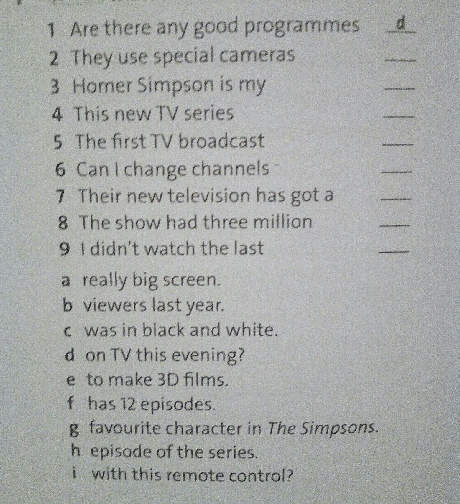 1. Are there any good programmes on TV this evening? (d) 2. They use special cameras to make 3D films. (e) 3. Homer Simpson is my favourite character in The Simpsons. (g) 4. This new TV series has 12 episodes. (f) 5. The first TV broadcast was in black and white. (c) 6. Can I change channels with this remote control? (i) 7. Their new television has got a really big screen. (a) 8. The show had three million viewers last year. (b) 9. I didn't watch the last episode of the series. (h)