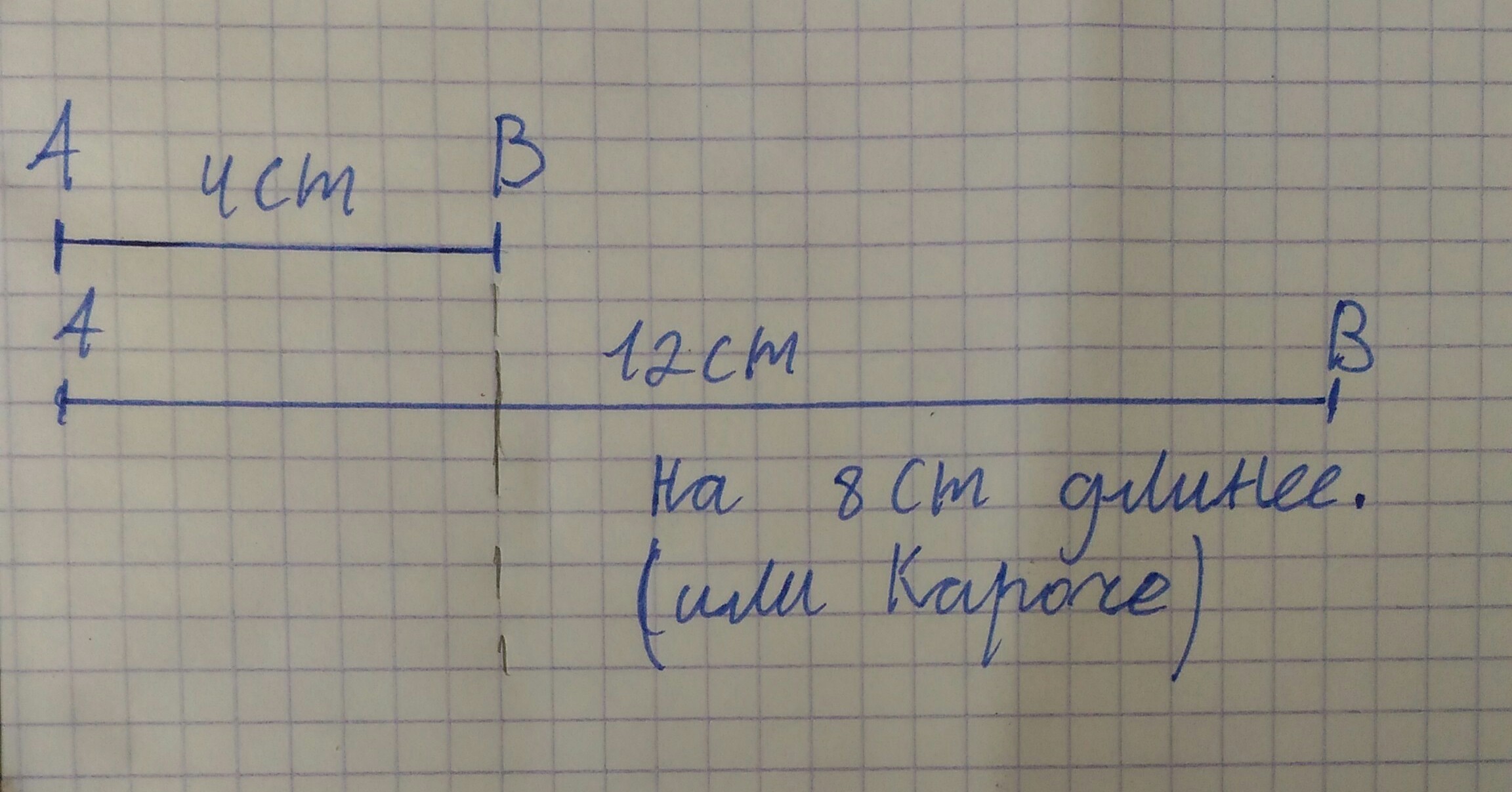 Начертите два отрезка так, чтобы длины одного была 4см, а длины другого - в 3 раза больше. Обозначь отрезки буквами и узнай, на сколько сантиметров один из них короче другого.