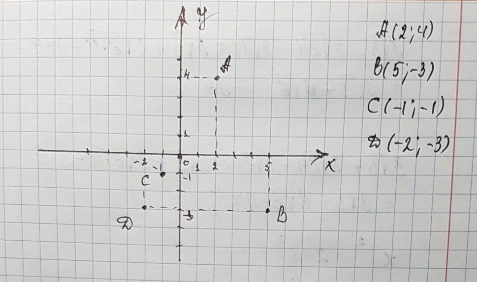 Постройте систему координат . Отметьте в координатной плоскости точки : (2;4); (5;-3); (-1;-1); (-2;-3)