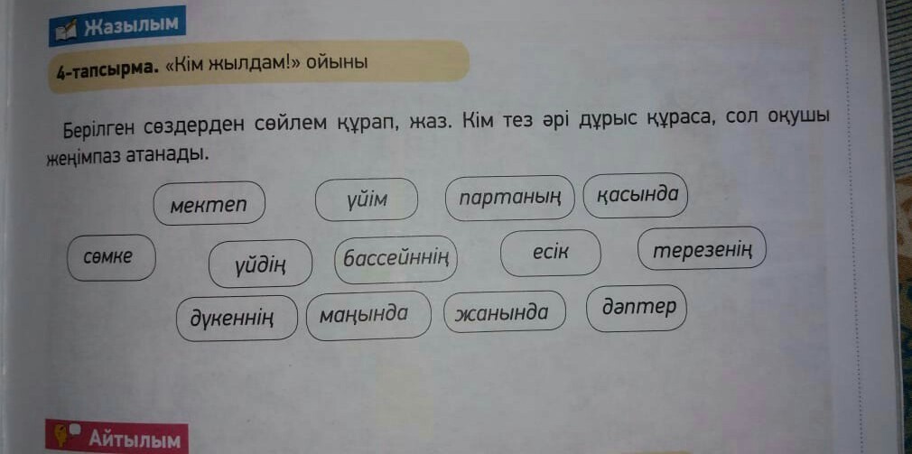 партаның үстінде менің дәптерім жатыр. дүкеннің маңында үйім тұр. терезенің алдында сөмке жатыр. үйдің қасында мектеп бар. бассейннің