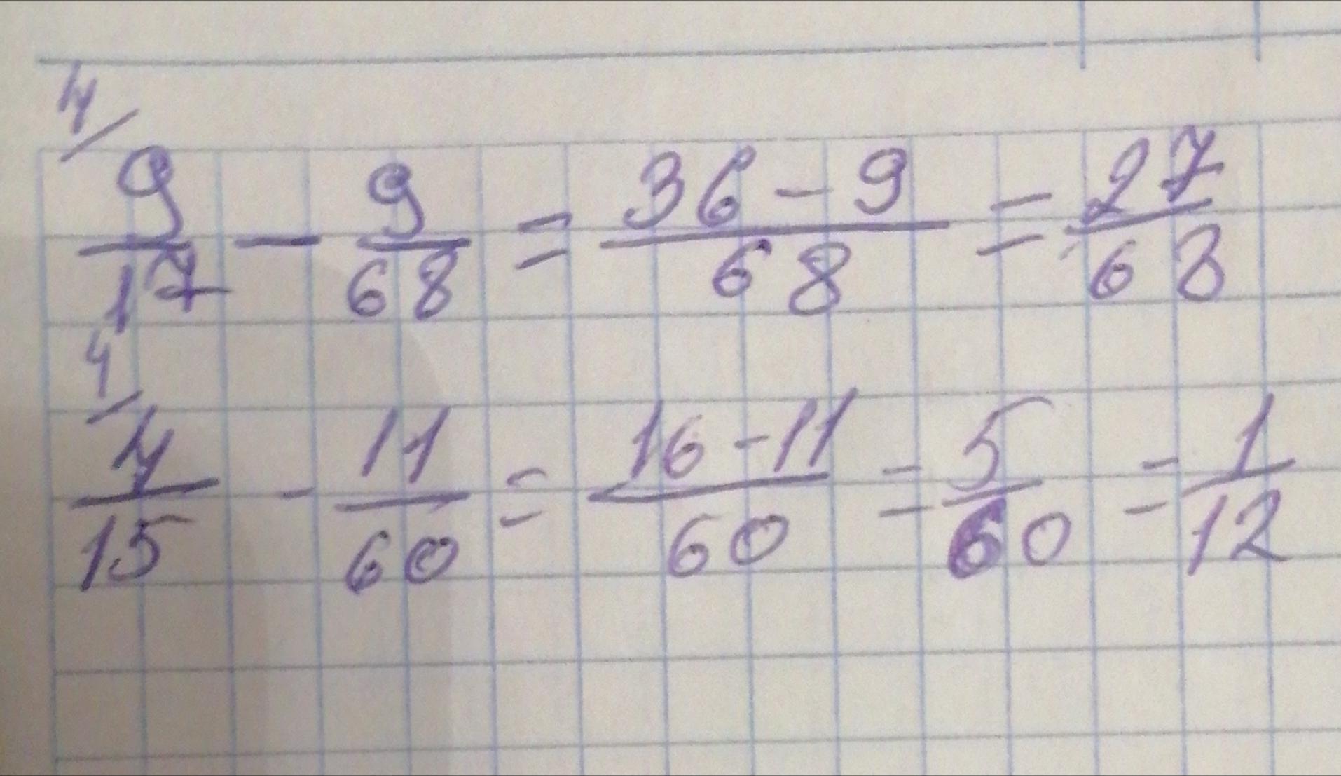 9/17-19/68=(17 надо умножить на 4 чтобы действие было правильным и получится 68,а так как 17 знаменатель а 9 числитель одной дроби,то 9 тоже умножаем на 4)значит 36-19/68=17/68(сокращаем на 17 т.е. 17 и 68 делим на 17) 1/4 это ответ на 1 вопрос